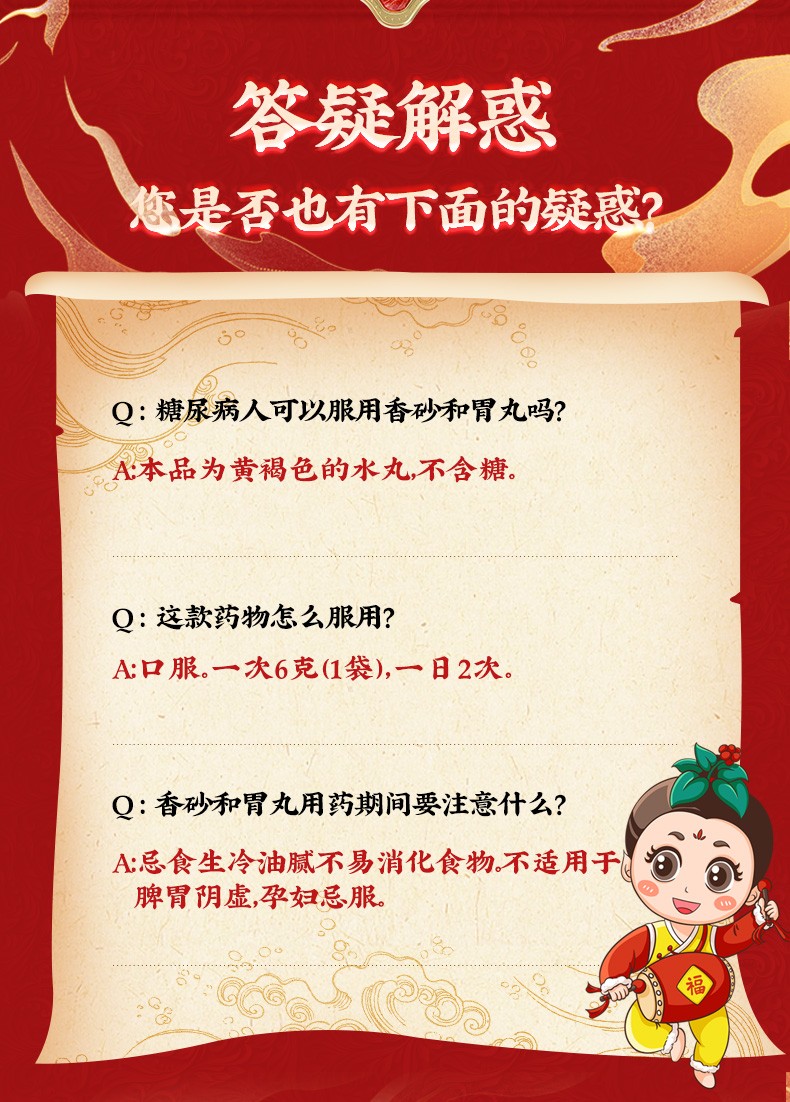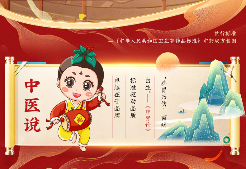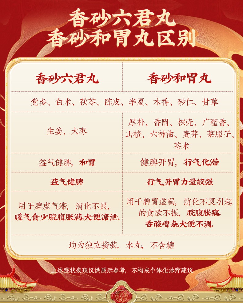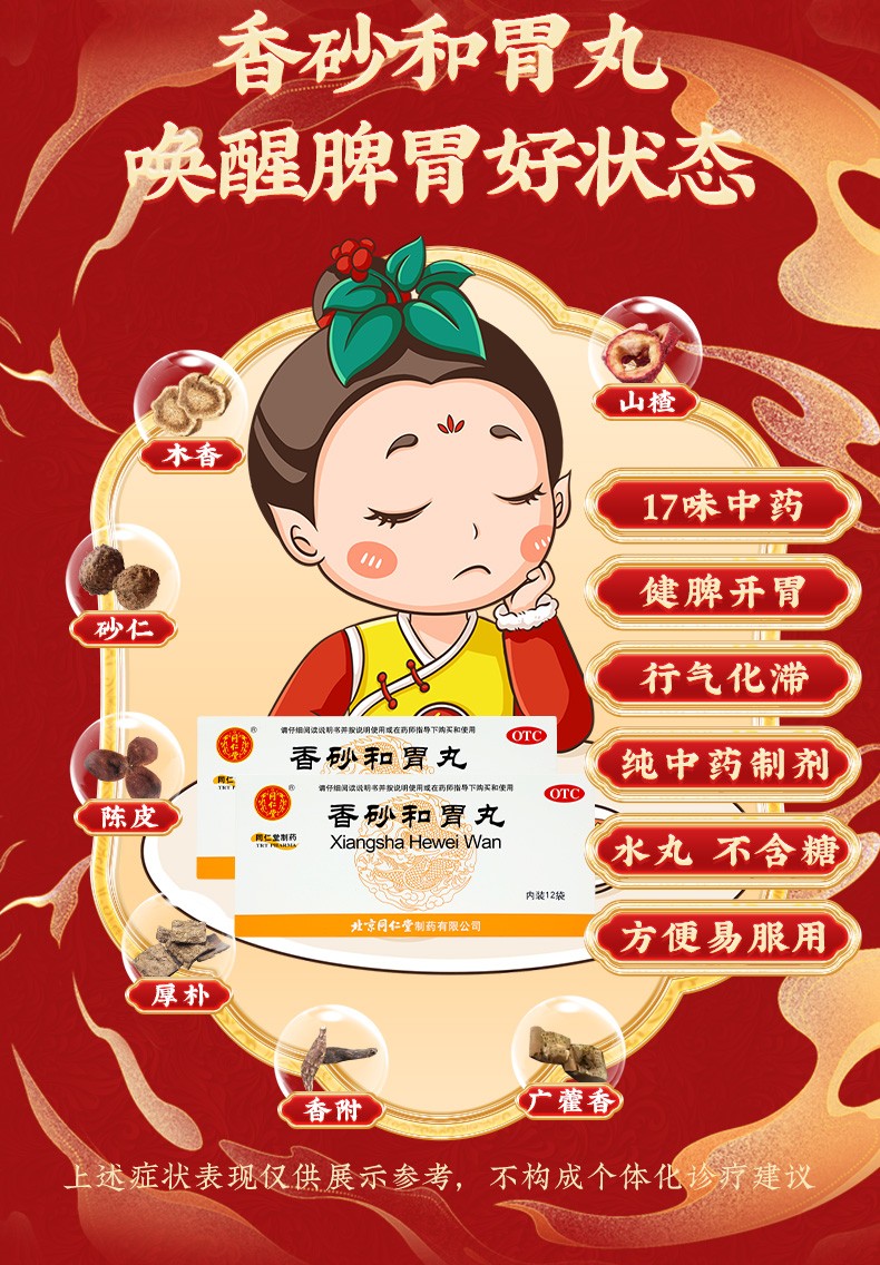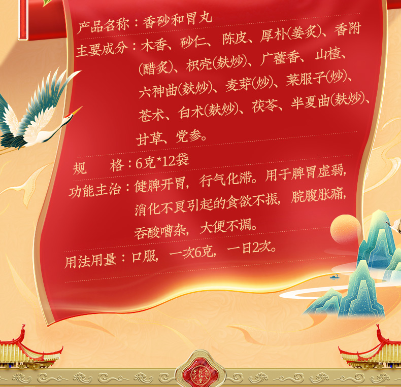 - 【成份】:木香、砂仁、陈皮、厚朴(姜炙)、香附(醋炙)、枳实(麸炒)、广藿香、山楂、六神曲(麸炒)、麦芽、白术(麸炒)、茯苓、半夏曲(麸 炒)、甘草、党参等17味