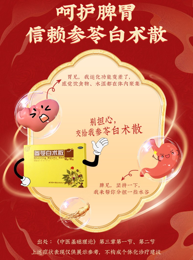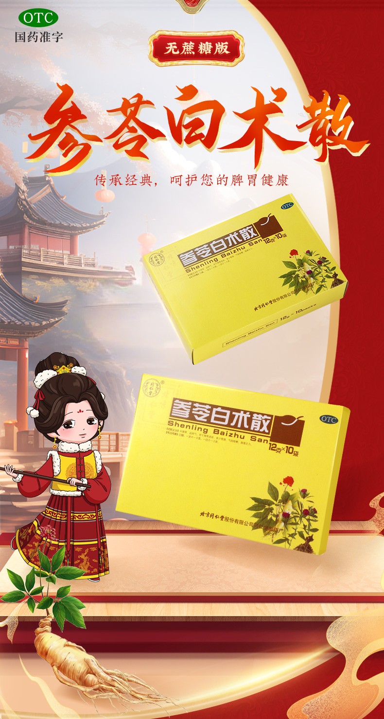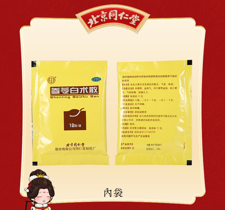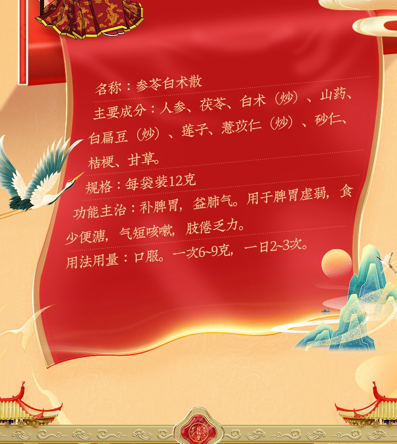- 【成份】:白扁豆、白术、茯苓、甘草、桔梗、莲子、人参、砂仁、山药、薏苡仁。