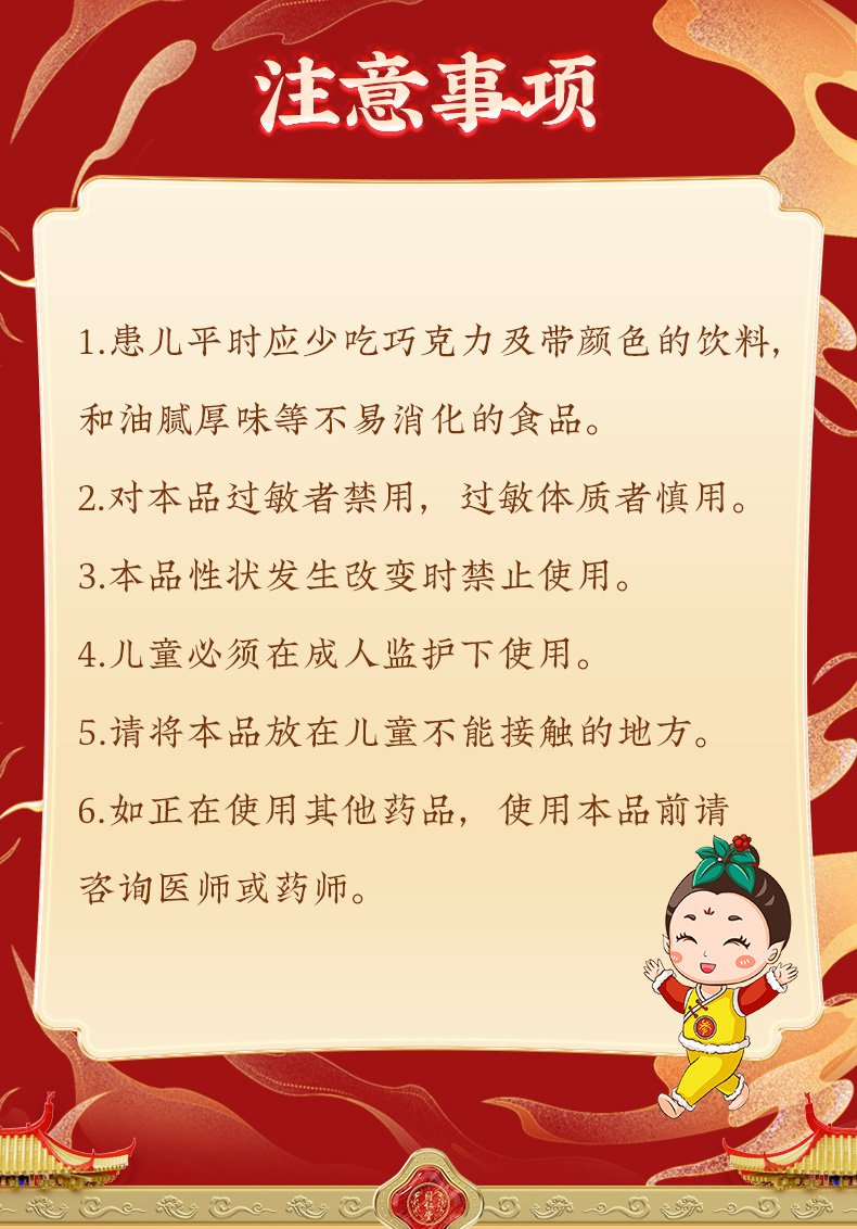 - 【注意事项】:1、患儿平时应少吃巧克力及带颜色的饮料,和油腻厚味等不易消化的食品。